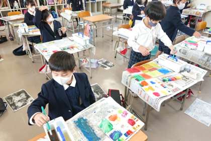 インクをつけて刷った版画に、絵の具で色をつけていきます。