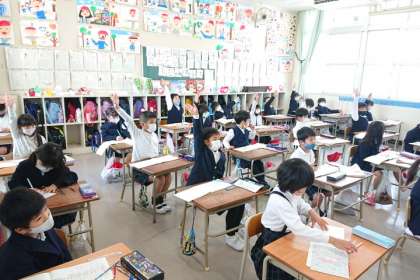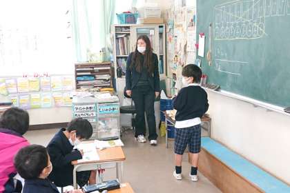 子どもたちが交代で前に出て黒板に式や答えを書いています。