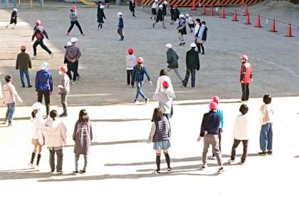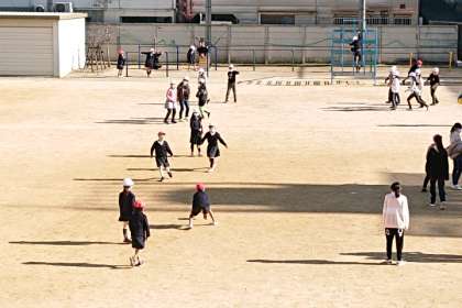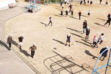 たくさんの子どもたちが運動場で遊んでいます。