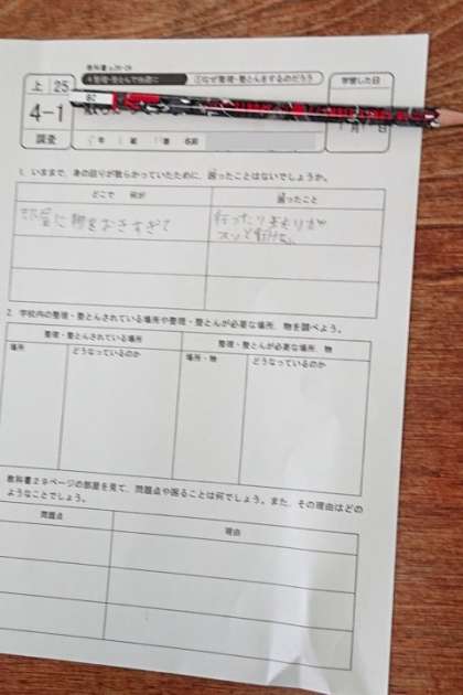 家庭科の時間には、今まで身の回りが散らかっていたために困ったことはないか、話し合いました。