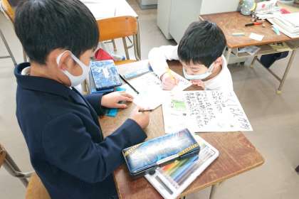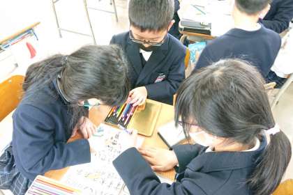 こくばん係、あいさつ係、はいたつ係、かぎ・でんき係、かざり係など、新しい係の掲示物を書いています。