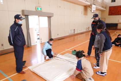 講堂では、消防署の方から、三角巾の作り方、心肺蘇生の方法、緊急時の担架づくりを教わりました。