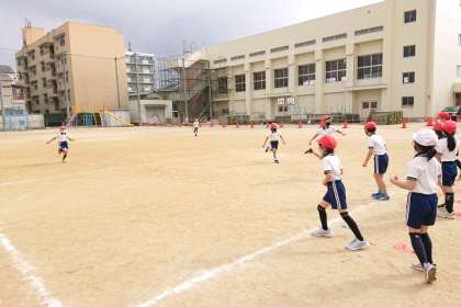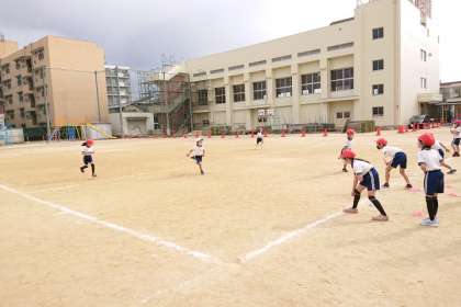 体育科の時間は、スタートから向こうのラインまで走って往復し、次の人にバトンタッチします。