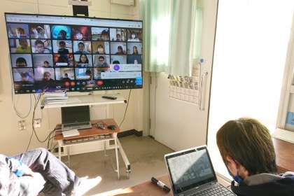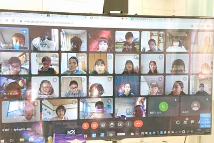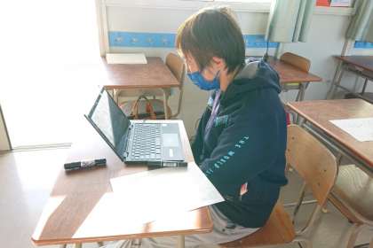 学級休業している6年生のクラスでは、学校と家庭とを結んでオンラインで朝の会を行いました。