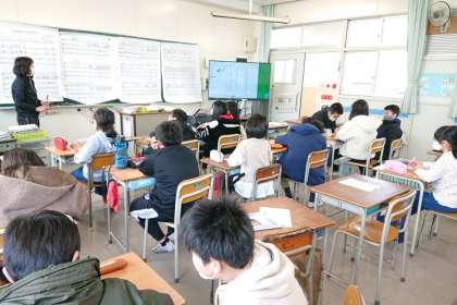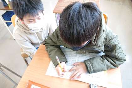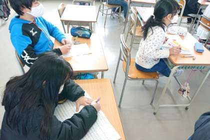 音楽科の時間は、教科書の器楽曲「アフリカン シンフォニー」の楽譜に、音符の階名を教科書に書き込んでいました。