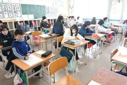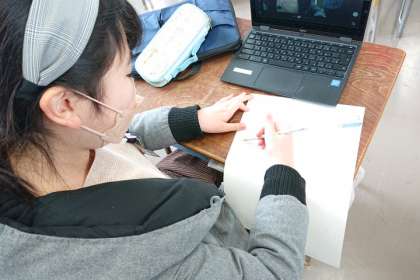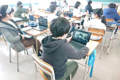 図画工作科の時間は、1人1台PCを使って自分の姿を撮影し、版画の下絵を書きました。