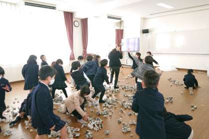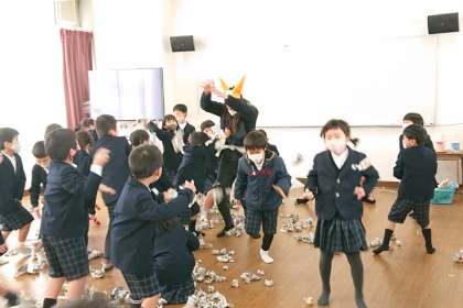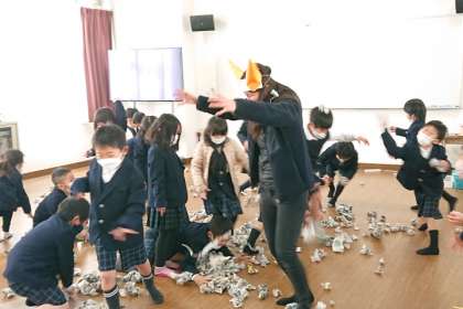 1年生では、新聞紙を丸めて「豆」を作り、みんなで豆まきをしました。