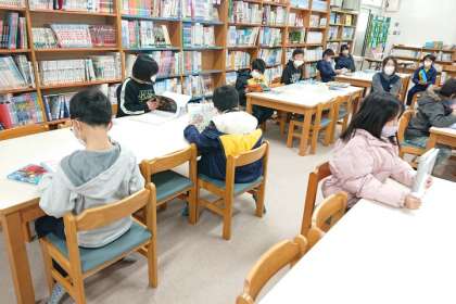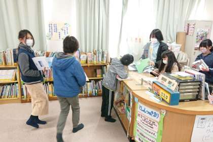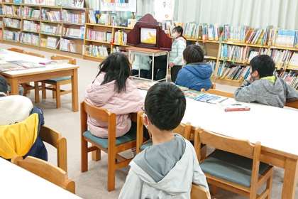 図書の時間、係の子どもたちが紙芝居の読み聞かせをしています。