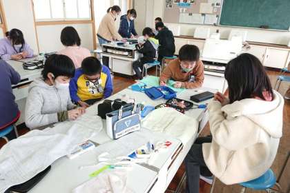 家庭科の時間は、6年生のみんなでミシンを使ったり、手縫いしたりして、手作りのぞうきんを作りました。