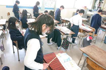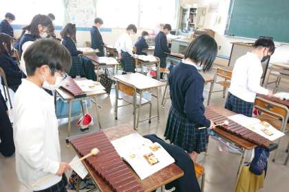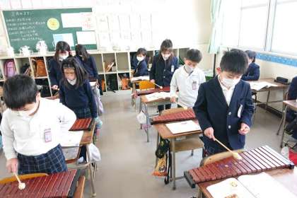 感染症拡大のため、鍵盤ハーモニカを吹いたり合唱をしたりすることができないので、子どもたちは木琴で「子ぎつね」や「ぷっかり くじら」などの曲を練習しました。