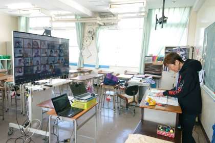 1人1台PCで、教室と各家庭を結んで学習しました。