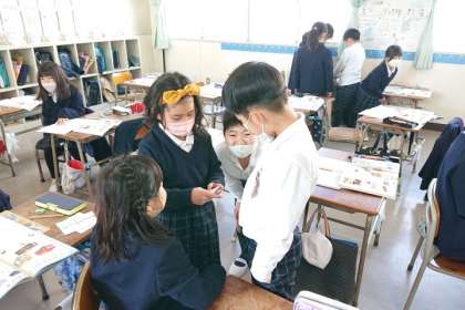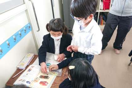算数科の時間は、箱の面を紙に写し取って、面の数や形を調べました。