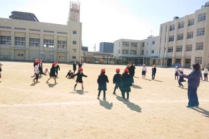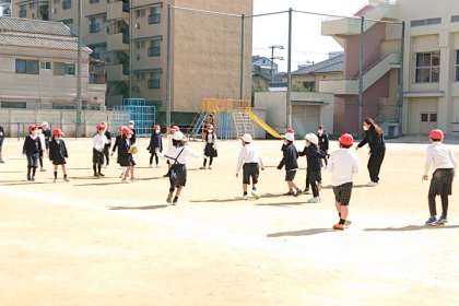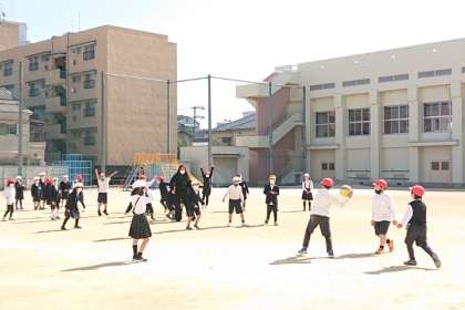 1年生の子どもたちが、運動場で楽しくドッジボールをしています。
