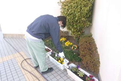 玄関のお花の水やりをしたり、窓の1枚ずつふいて、きれいにしています。
