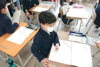 「せかいで いちばん ふしぎなで きれいな〇〇」をテーマに、厚紙に下書きを描いています。