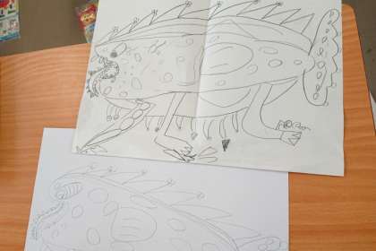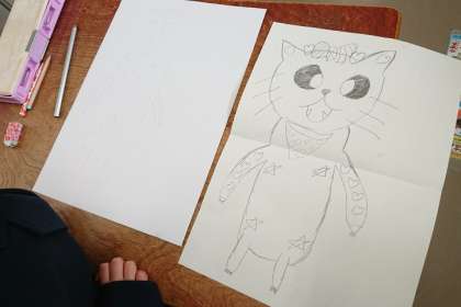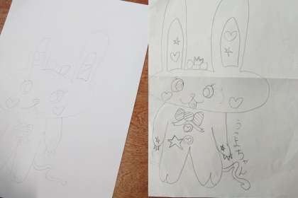「せかいで いちばん ふしぎなで きれいな〇〇」をテーマに、厚紙に下書きを描いています。