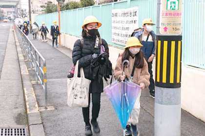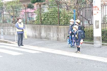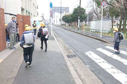 小雨が降る中、子どもたちは傘をさして登校しています。