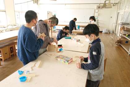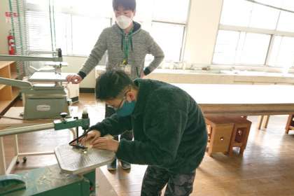 図工室で、木切れを電動糸のこぎりで切って、セロハンテープカッターを作っています。