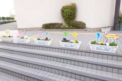 正門のお花は、飼育栽培委員会の子どもたちが育てました。