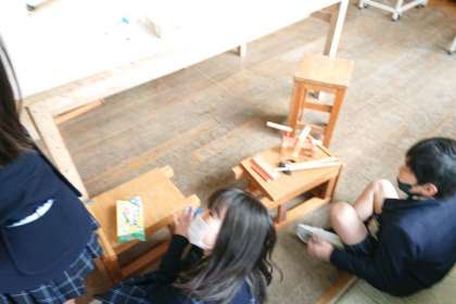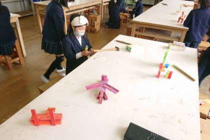 子どもたちが図工室で、木切れに色を塗り、穴をあけたりくぎを打ったりして作品を作っています。