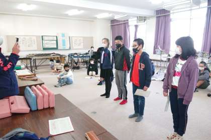 卒業式前日の今日は、6年生からのお礼のメッセージと合奏を、オンラインで音楽室から各教室に生中継しました。