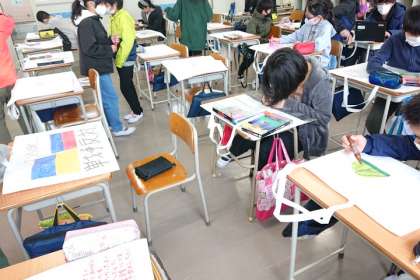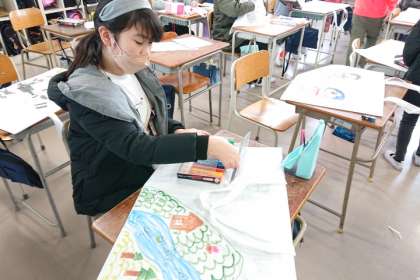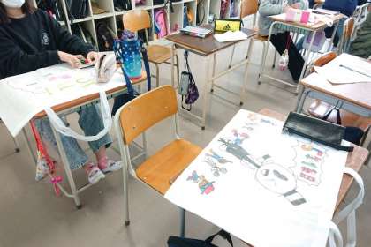 子どもたちが、1年間の作品を入れる袋に思い思いの絵を描いています。