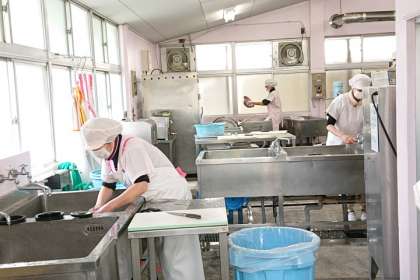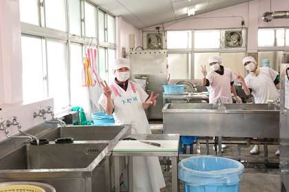 給食調理員、子どもたちのためにおいしい給食を心をこめて一生懸命作っています。