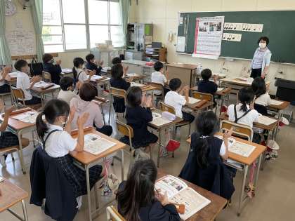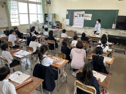 3年生の音楽の学習です。音符を見てリズムを口ずさんだり手拍子で合わせたりしています。