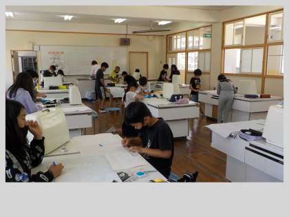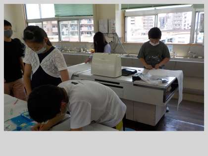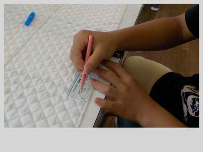 ミシンで縫うところにチャコペンシルでしるしをつけます。まち針の扱いも難しい!