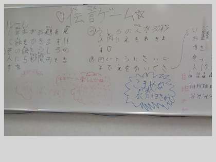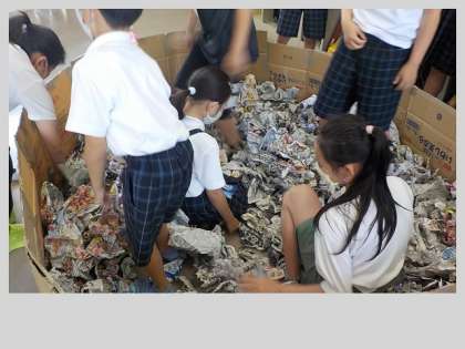 大きな段ボールで囲まれたプールの中に隠された宝をみんなで探します。