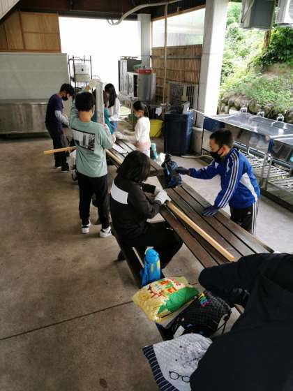 現地についてからは、昼食を食べ、避難訓練をしたあと、キャンプファイヤーで使うトーチづくりをしました。