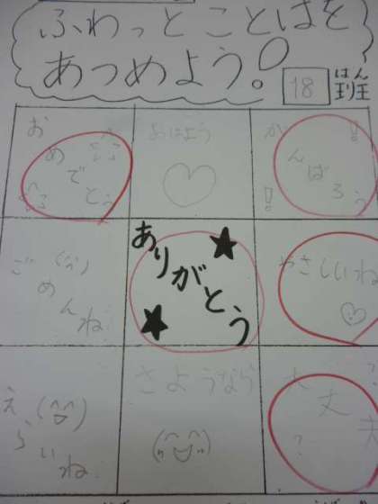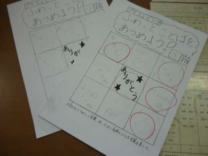 「プラスとビンゴ」とは、友達に言われてうれしい言葉やあたたかい気持ちになる言葉(※ふわっと言葉)を集めてビンゴをする活動です。