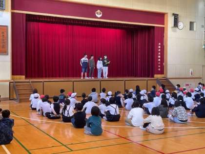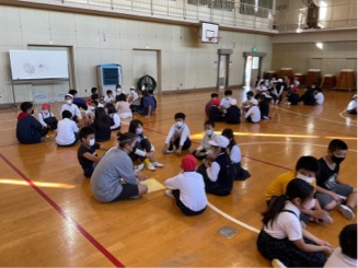 先日の児童集会の様子です。3+2や5−1などの計算問題を聞いて、その答えの数だけ手をたたきます。計算の答えを確かめ合うなど、班で円になって楽しそうに活動していました。