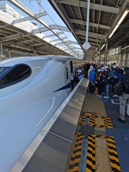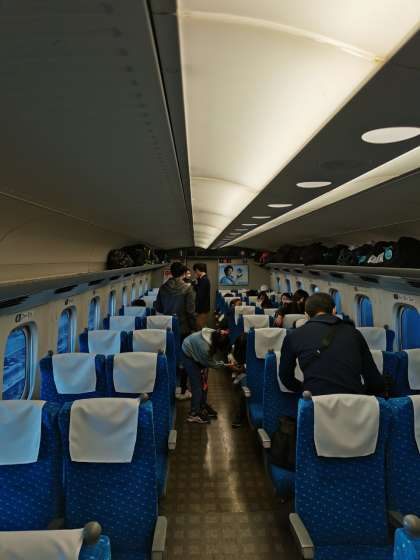 定刻どおり新幹線は出発しました。車内では今日の活動の確認をしています。