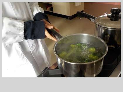 卵焼き、こふきイモ・ブロッコリーのサラダを作っています。