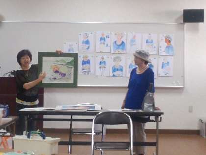 その後、水彩画の多田先生をお招きして、水彩画の楽しみ方や作品評価の方法を教えていただきました。先生方は、自ら水彩画を描いて、全員で楽しく評価し合いました。