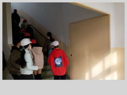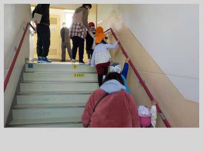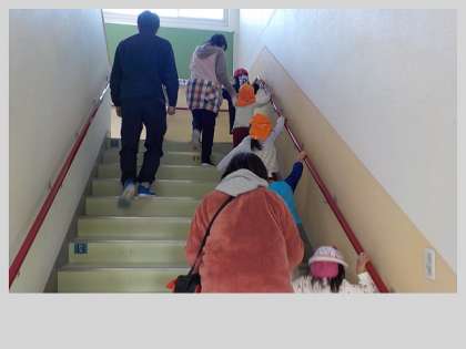 迷わず高い所への避難です。本校は4階まで校舎がありますから、全員4階に避難です。お隣の野里幼稚園は2階までしか校舎がありませんから、園児の皆さんも歌島小学校に避難します。4階までは大変です。でも、自分の命を守るためです。一生懸命階段を上ります。幼稚園の先生だけでなく、本校の教職員も園児にけががないように見守りながら声をかけます。