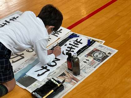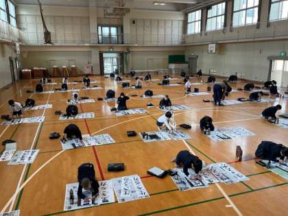 講堂で3年生が書初めを行いました。床にしいた半紙に向かって児童たちはひざをついて姿勢を整え、一画ずつ丁寧に書いていきます。いつも教室の机で書く時とはちがいますね。みんな静けさの中とても集中しています。