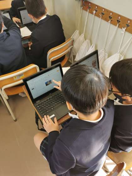 3年ではいろんな国のことを調べてスライドにまとめています。メモをもとに画像を貼り付けたりキャプションをつけたりしています。グループで協力してがんばっています。