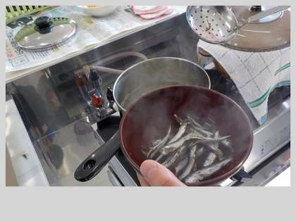 出汁は、関西ではあまりなじみがない、いりこでとります。頭とはらわたを取りのぞくところからです。出汁をとったあとも、きれいにすくっていりこを取り除きます。