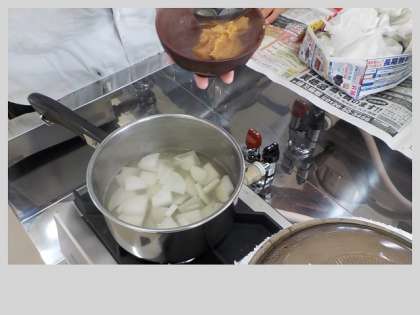 具材は大根と油揚げ、白ねぎです。大根を先に入れ火を通します。その間に味噌をとき待ちます。大根が透き通ったら、のころの具材をいれ、火を通します。最後に味噌を入れ、香りが飛ばないうちに火を止めて関税です。