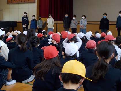 今日は飼育栽培委員会の発表でした。内容は、飼育栽培委員会がいつもお世話している亀や植物に関するクイズでした。3択問題を帽子の色で回答します。全問正解の人はいませんでしたが、問題に正解した児童からは「よっしゃー!」と喜ぶ声が聞こえてきました。