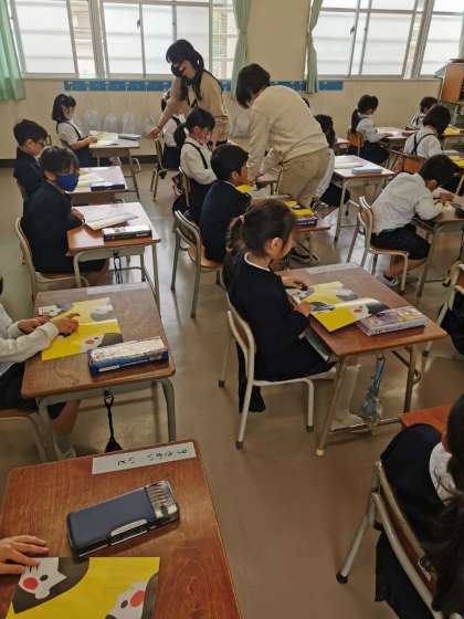1年生では朝のルーティンの確認に始まり、グループで活動したり、いろんな教科書をみたりしました。
