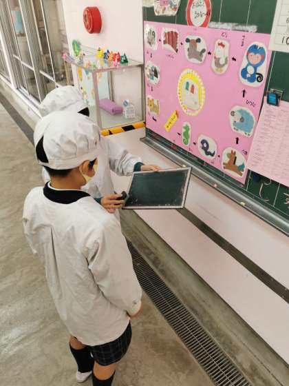 委員会活動もスタートしています。給食委員会では経験している6年生が5年生に教えてくれています。