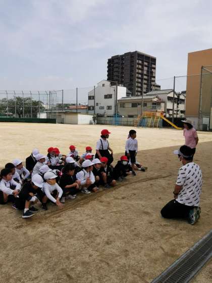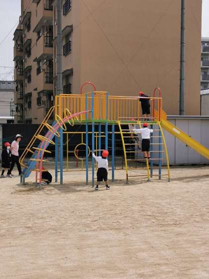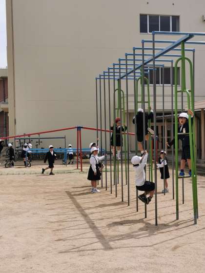 1年生がみんなで運動場で遊んでいます。遊び方を覚えて安全に楽しく遊べるようになるといいですね。