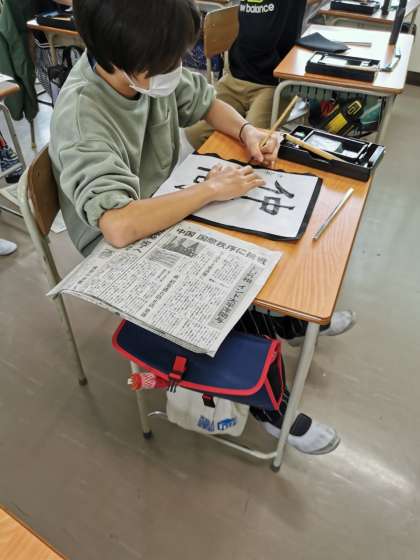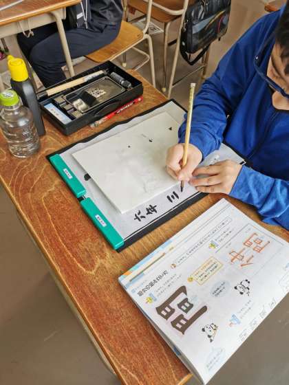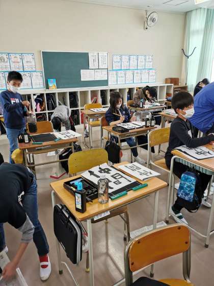 6年生は習字の学習中。小筆で丁寧に書こうとしています。