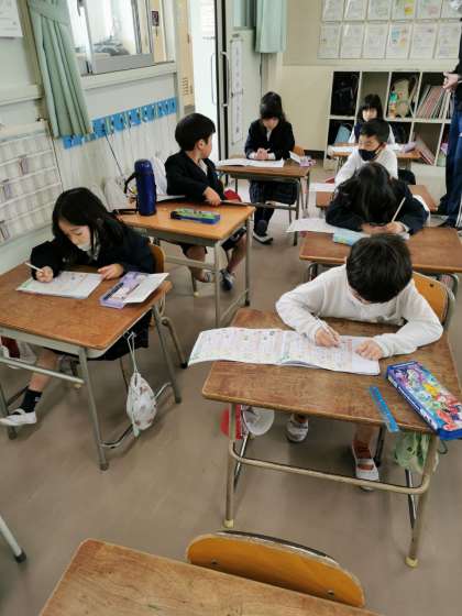 繰り返し読んで、繰り返し指で書いて、丁寧に練習、というように2年生が漢字の学習をしていました。