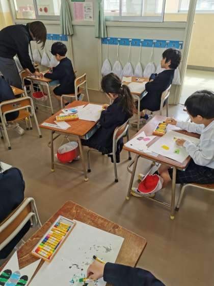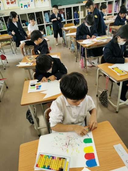 1年生はこいのぼりを作っています。クレパスでしっかり色付けしています。