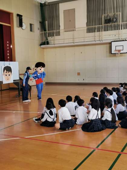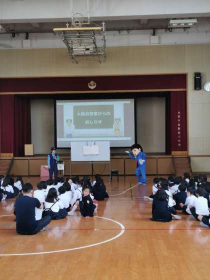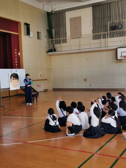 3時間目、1年生から3年生は防犯教室で学習しました。不審者のこと、不審者に声をかけられたときどうすればいいかなど、普段気をつけるべきことを大阪府警の方に教えていただきました。