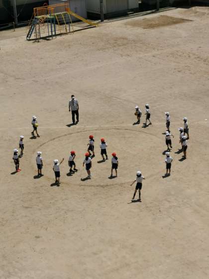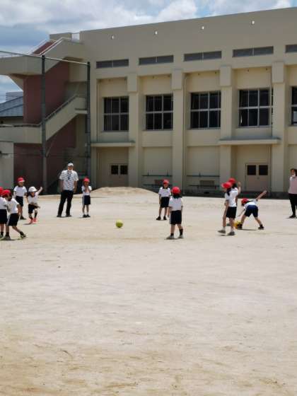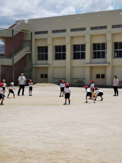 1年生体育では転がしドッジボールをしています。今日は本当にいいお天気です。